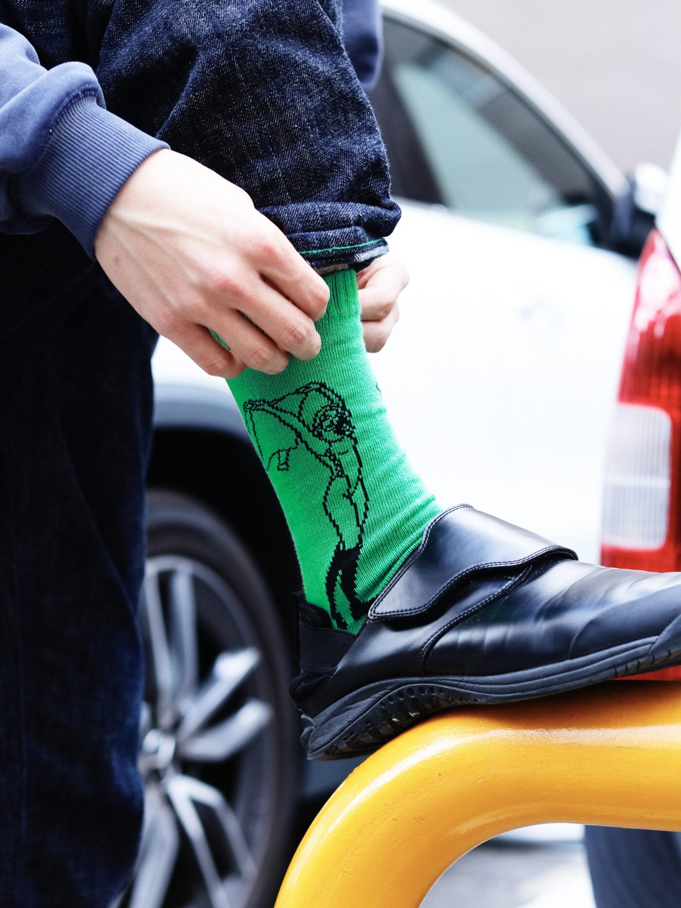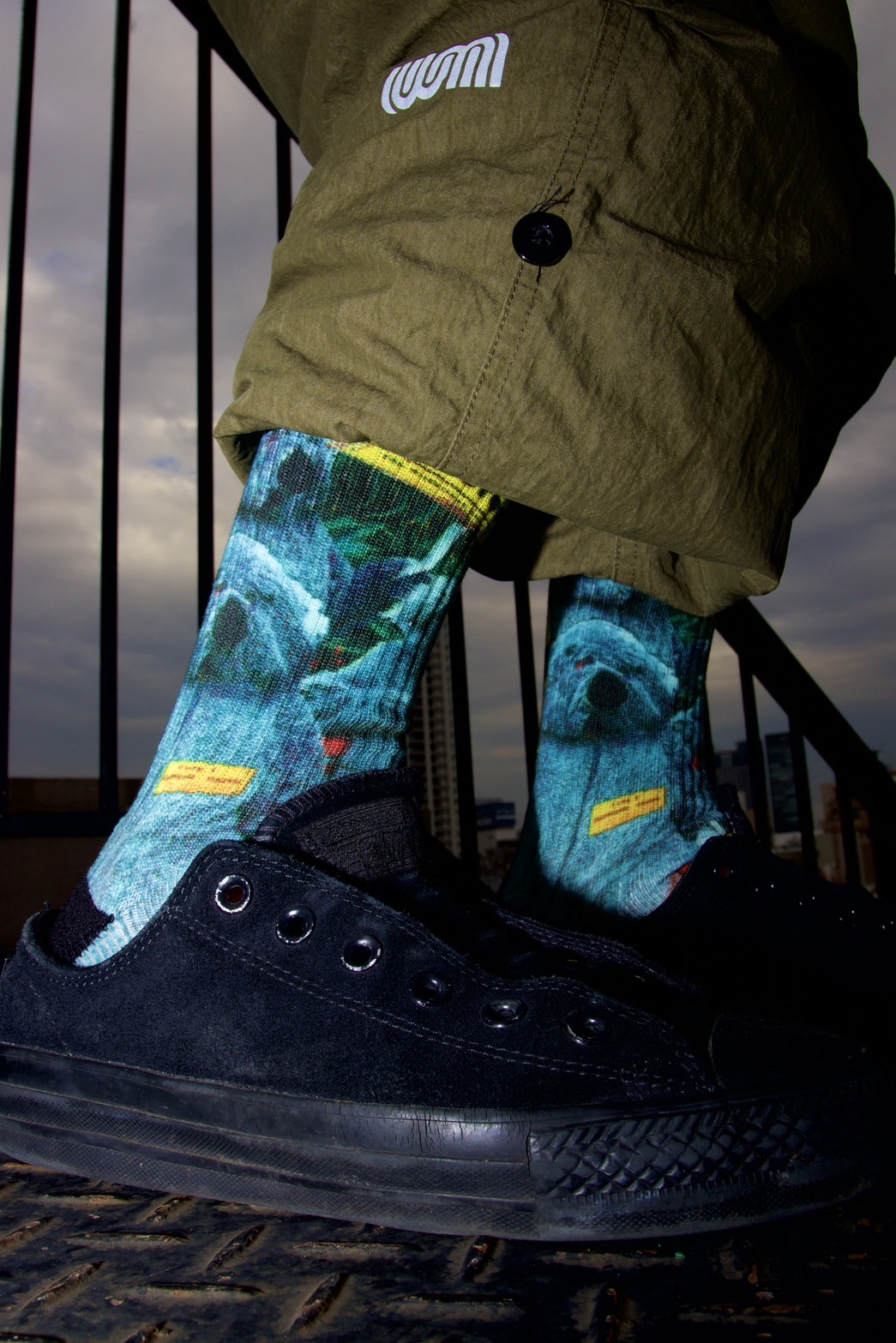 コラージュアーティスト ASOTA の新作 Save the Forests をプリントしたアートソックス。複数の森の情景を重ね合わせた奥行きのある世界にどこかユーモラスな着ぐるみのキャラクターが現れる1足。