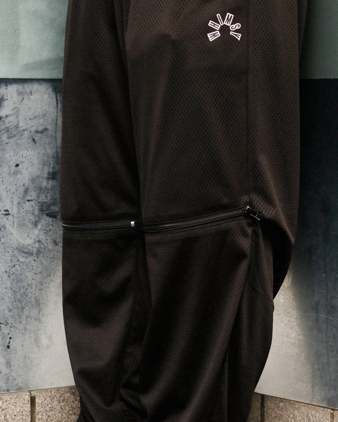 通気性と軽さを兼ね備えた、WHIMSYのメッシュパンツ。立体感を演出する為に膝にジップを配置し、裾のドローコードにより調整も可能。