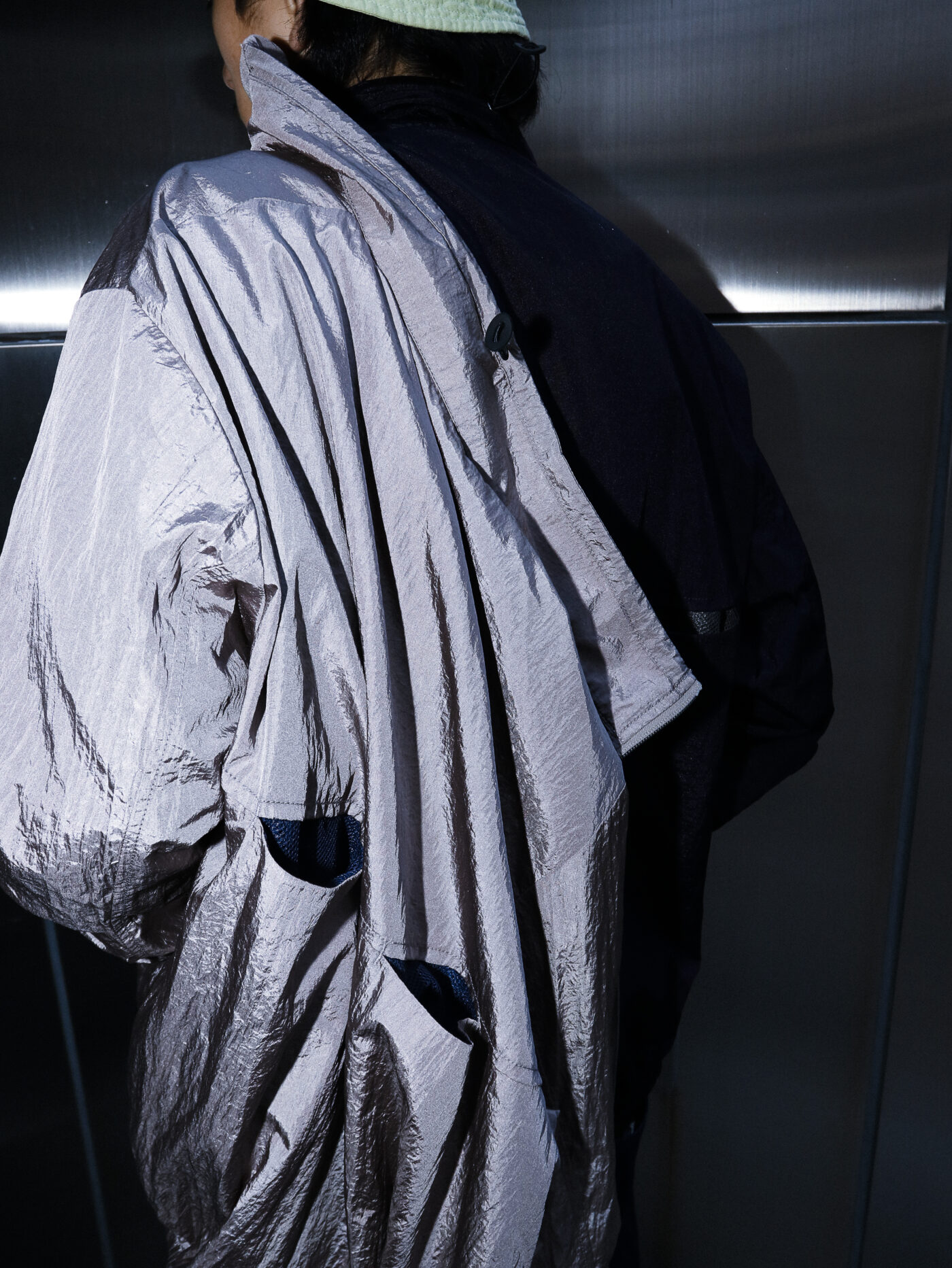 表地はナイロン、裏地には速乾性の高いポリエステルを使用し、適度な通気性と撥水性を担いながらも軽量。身ごろ1周するベンチレーションが初夏の湿気に対応するうえに、後身ごろのベンチレーションはポケットとしても機能する。裏地のパイピングによりラフな印象を締めつつカラーでWhimsyらしさを表現した1着。